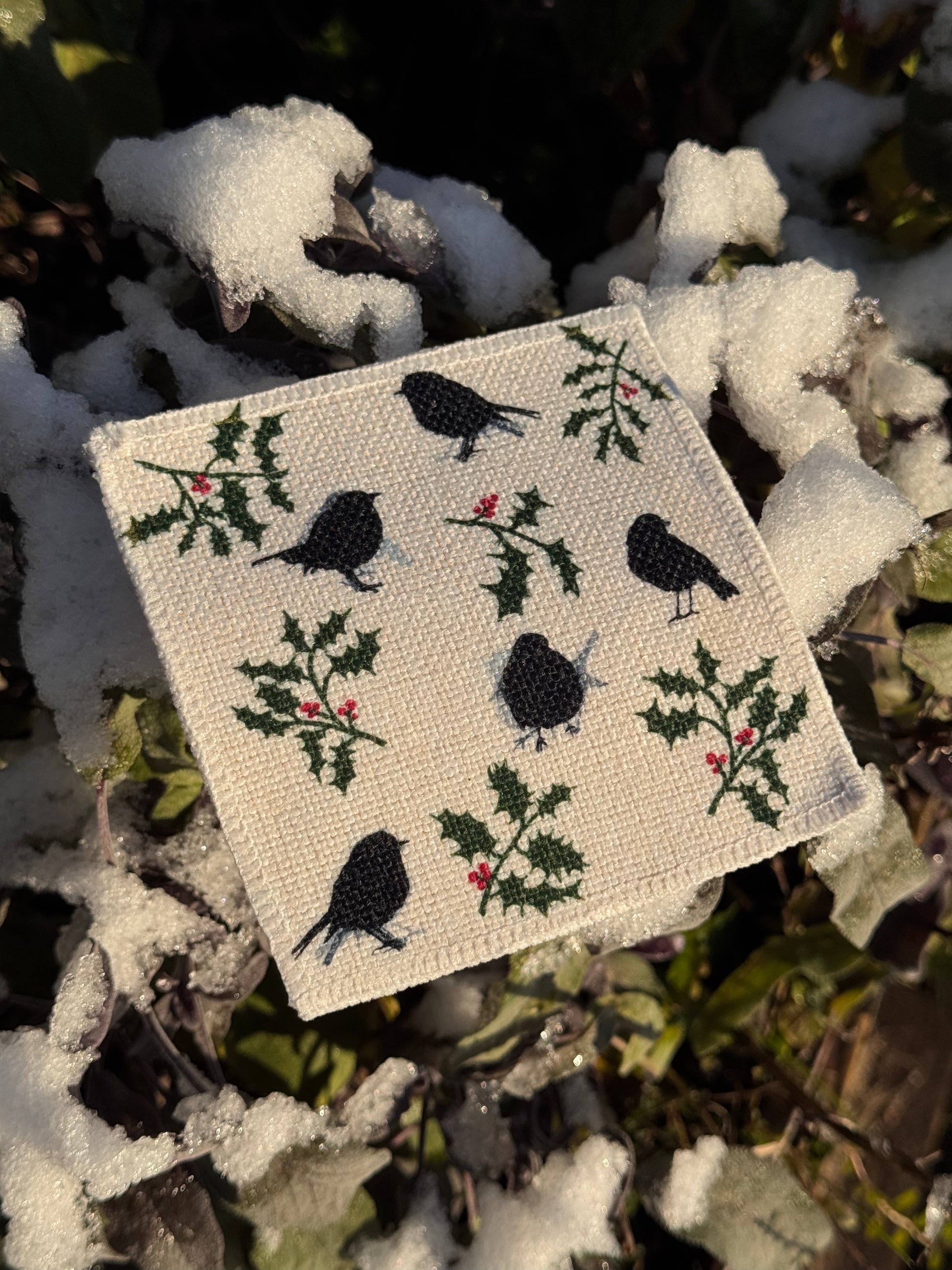 Sets of linen coasters, to match our linen table mats, decorated with Sandra's new festive robin and holly design.