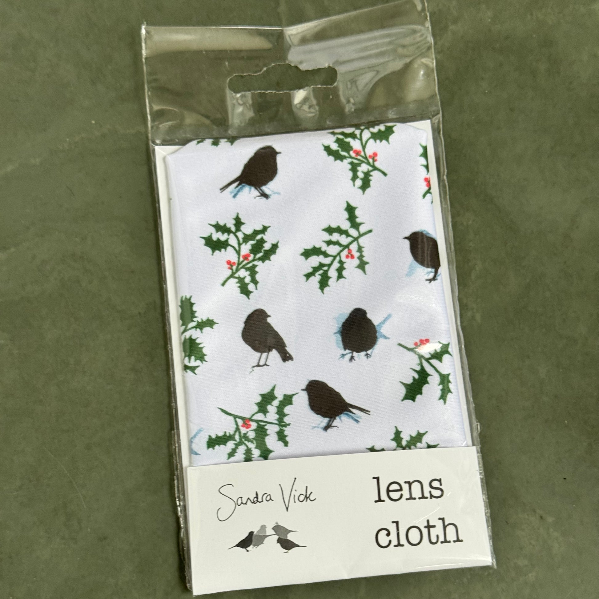 A lens/screen cloth (175x150mm) with festive robin and holly design.