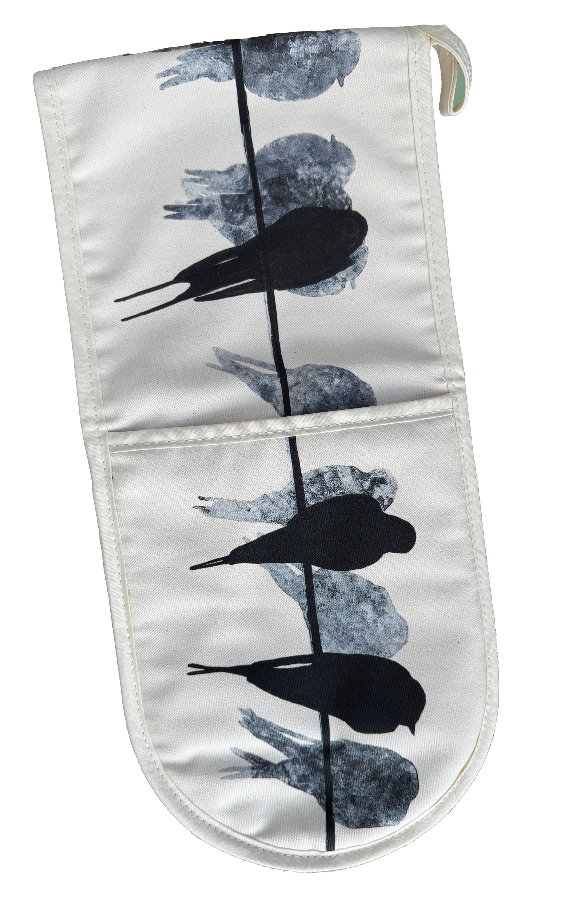 A pair of double oven gloves with our **NEW** Swallows on a wire design printed on unbleached cotton.