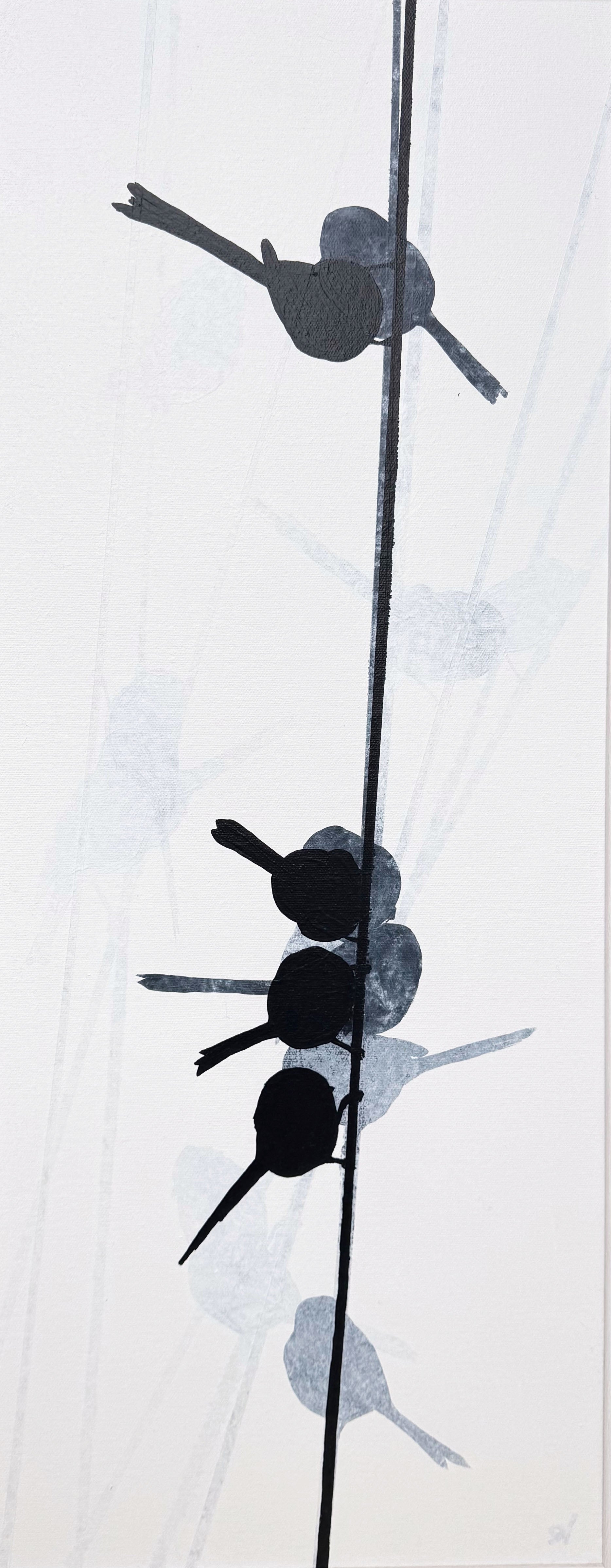 An original acrylic painting of long-tailed tits by Sandra VIck.