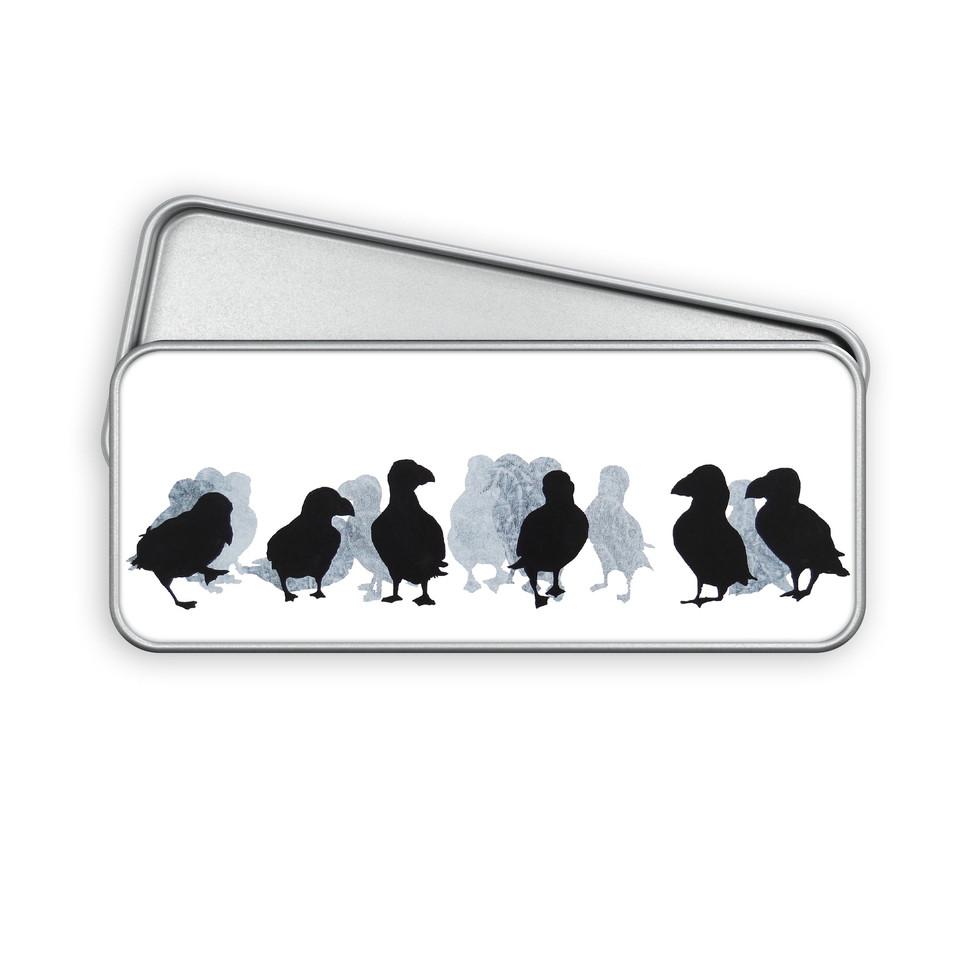 Bring a touch of coastal charm to your desk or bag with our beautifully illustrated puffin pencil tin. Featuring Sandra Vick’s signature silhouette design, this tin captures the character and charm of puffins as they return to their nesting grounds.