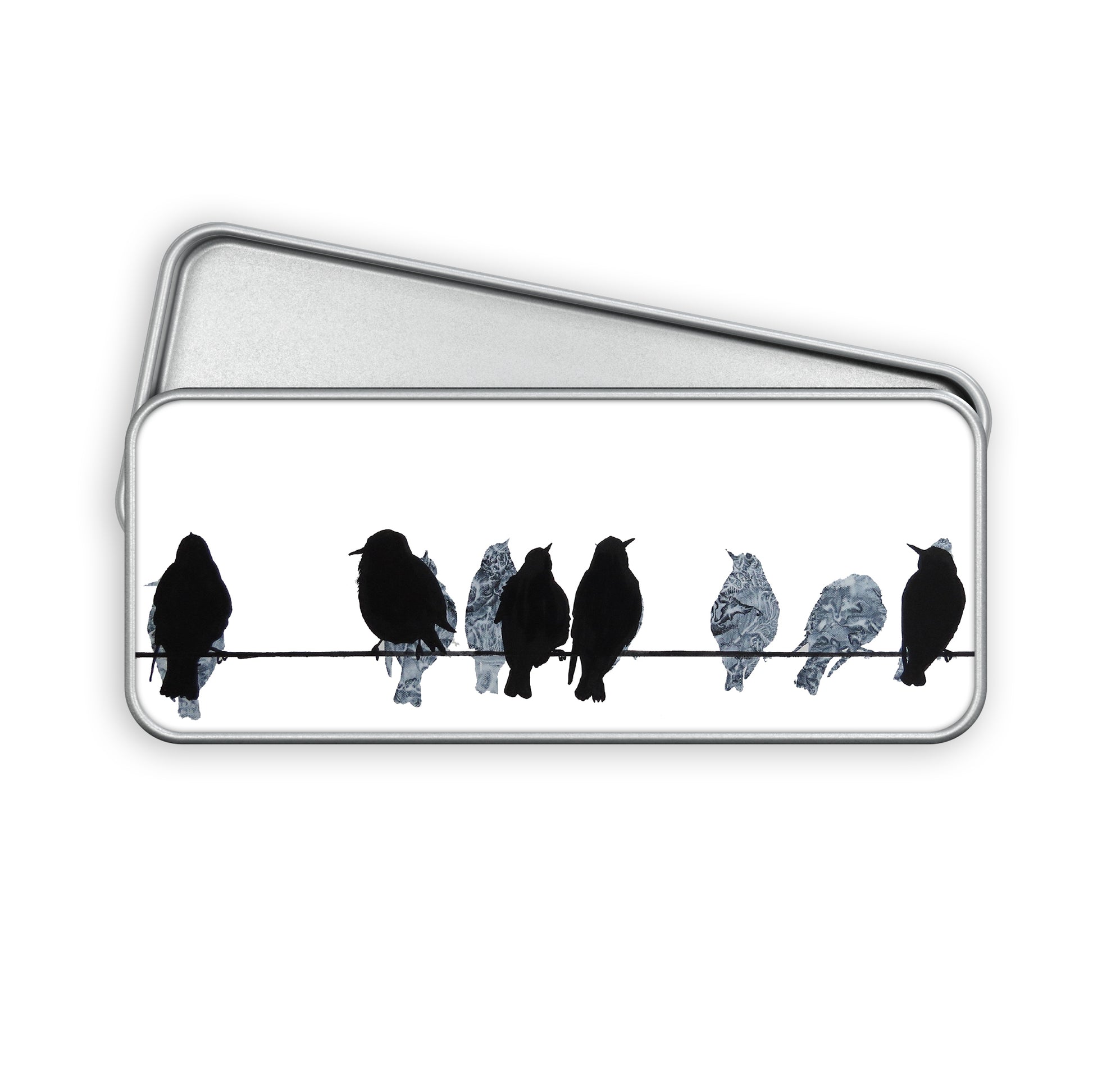 Bring a touch of nature’s brilliance to your desk or bag with our beautifully illustrated starling pencil tin. Featuring Sandra Vick’s signature silhouette design, this tin captures the quiet beauty of starlings gathered on a telegraph wire, a moment of stillness before they take to the skies.